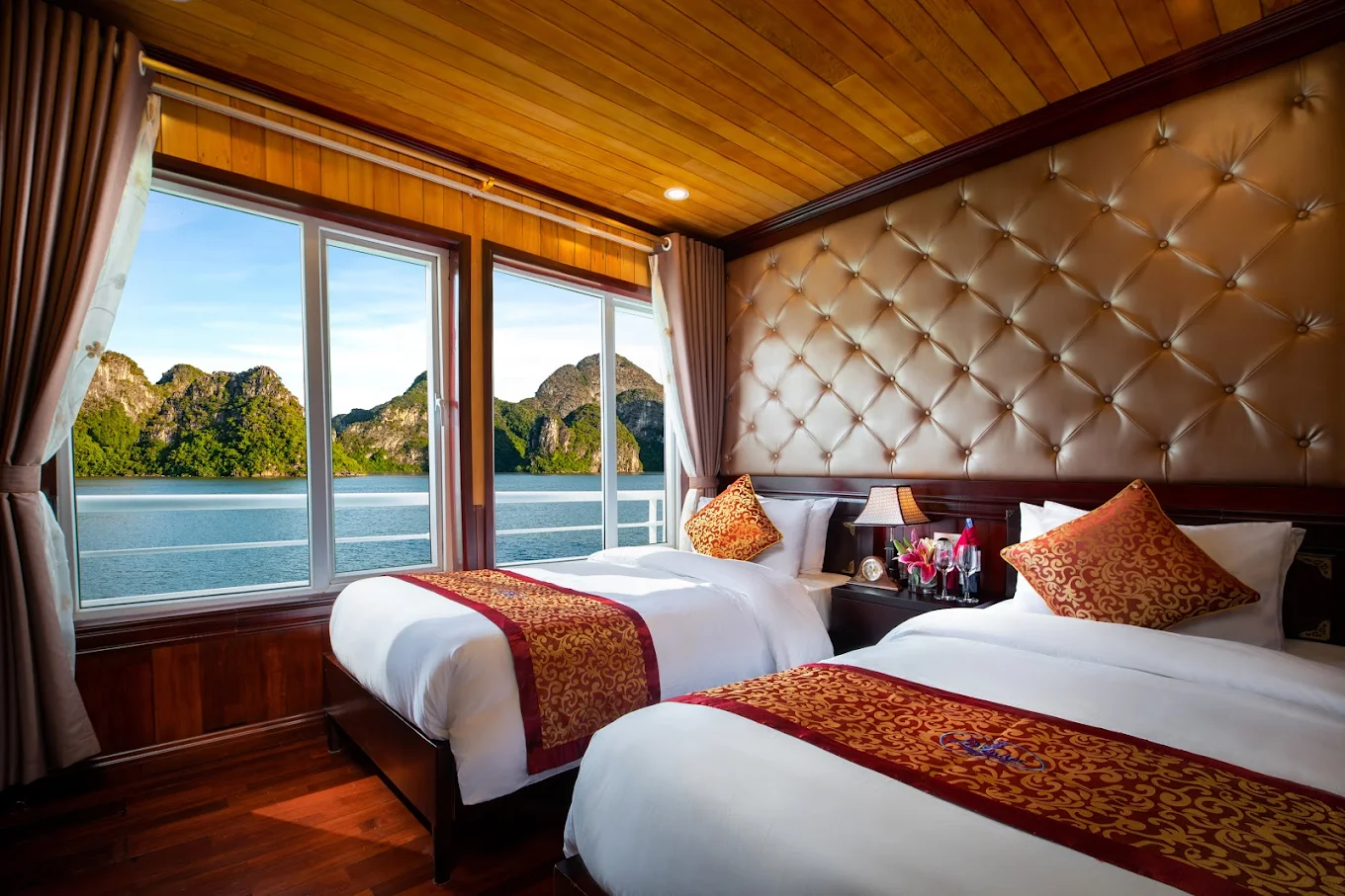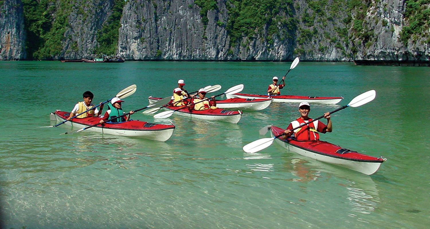 Drive through green rice paddy fields to Ha Long Bay. You will board a junk for a cruise among the hundreds of islets of Ha Long Bay. Enjoy a seafood lunch and a swim (if weather permits) before visiting a grotto of gigantic stalactites and stalagmites. Drop anchor in the late evening for an overnight stay among the dramatic limestone peaks rising out of the sea.